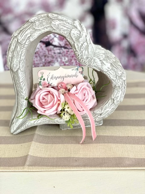 Angyalszárny mintázatú álló betonszív díszítve minőségi selyemvirágokkal, zöldekkel, anyák napi fa táblával, 20x18x10 cm