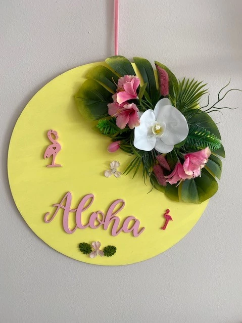40 cm fa alap citromsárgára festve, díszítve minőségi selyemvirágokkal, zöldekkel, rózsaszín Aloha fa felirattal, flamingókkal.