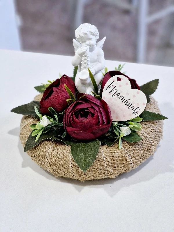 Szalma alap borítva juta szalaggal, díszítve angyalkával, minőségi selyemvirágokkal, zöldekkel, Szeretlek Anya fa szívecskével. A szív kérhető az alábbi feliratokkal: Szeretlek Anya, Mamának, Dédinek, Anyák napjára, Keresztanyának, Dédinek. Ez a megrendelés legvégén lévő megjegyzés rovatba szükséges jelezni Amennyiben nincs jelzés, Szeretlek Anya felirattal küldöm. 13x15 cm