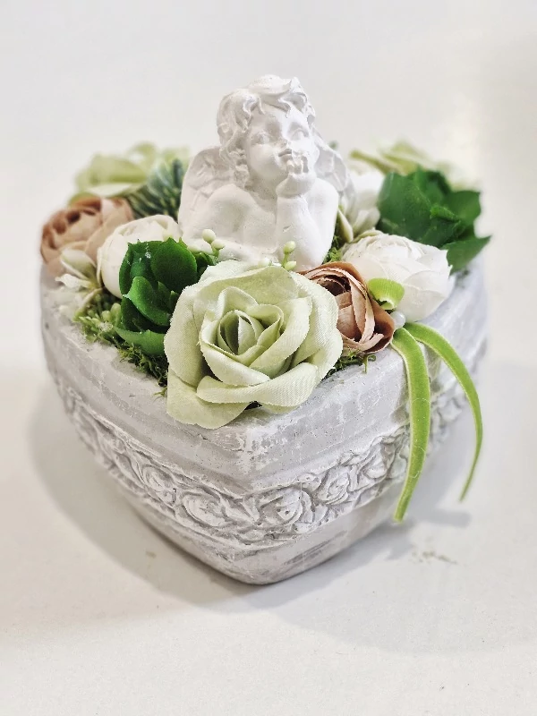 Szív tál díszítve angyalkával, minőségi selyemvirágokkal, zöldekkel, bársonyszalaggal, 13x12 cm
