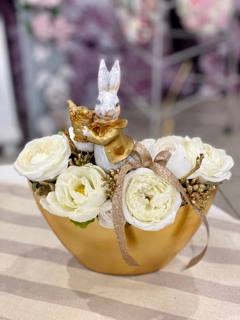 Arany csónaktál díszítve minőségű, élethű selyemvirágokkal,arany kiegészítőkkel, kerámia nyuszival, 21x11x24 cm