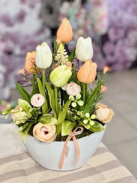 Fehér csónaktál díszítve minőségi, élethű gumitulipánokkal, selyemvirágokkal, zöldekkel, 22x13,5x31 cm