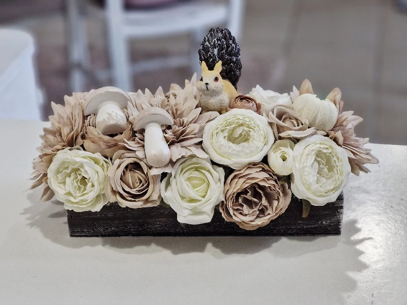 Barna fa láda díszítve minőségi selyemvirágokkal, gipsz gombákkal, mókussal, gipsz tökkel, 30x18x17 cm