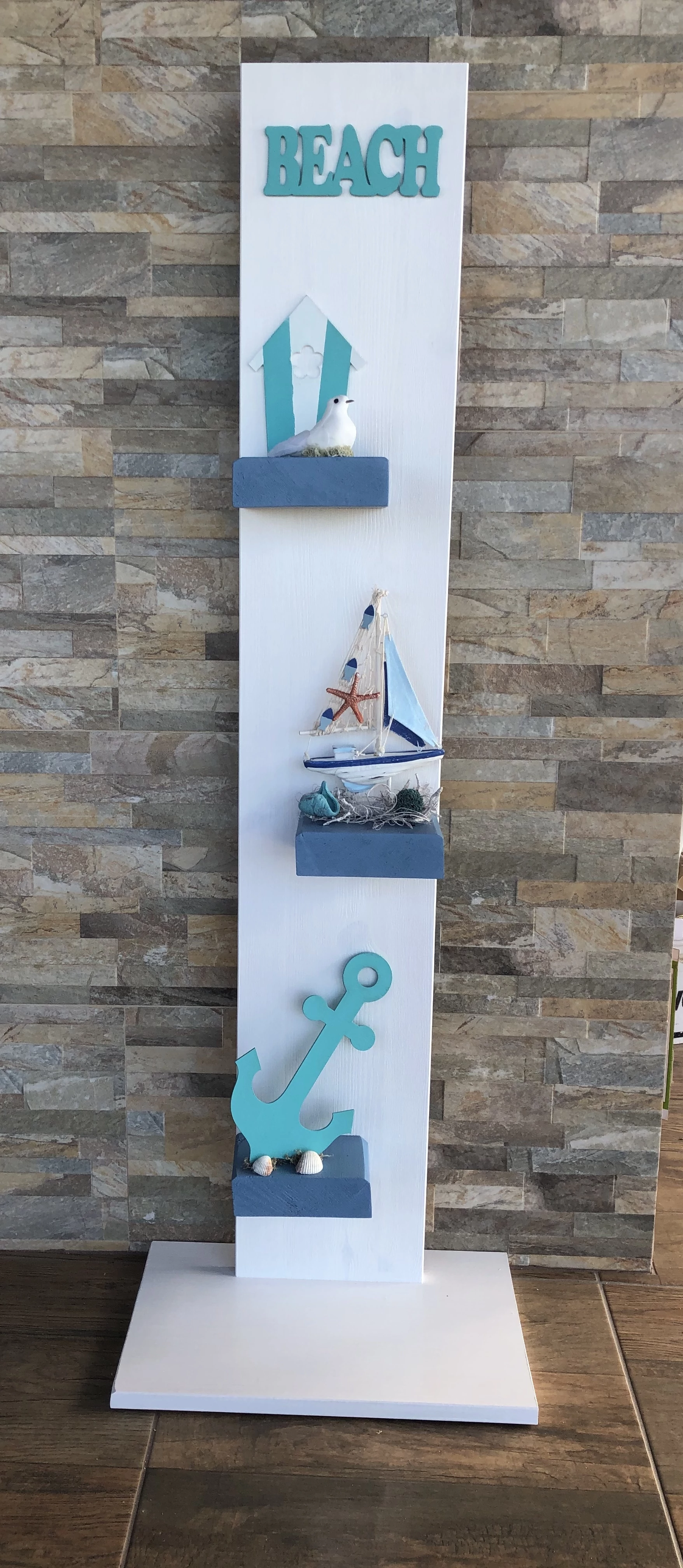 Tömör fa hazaváró állvány, 3 polccal, vitorlással, horgonnyal, galambbal díszítve. Beach felirattal. Kérhető egyedi színben, egyedi díszítéssel! 120x25 cm.