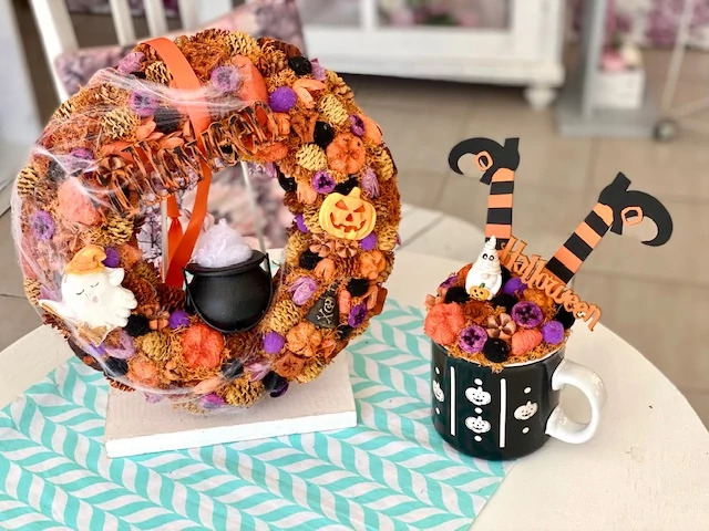Fekete tök figurás bögre díszítve termésekkel, fa boszilábbal, figurával, Halloween fa táblával, 10x22 cm