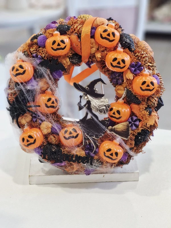 Szalma alap díszítve termésekkel, fa boszorkánnyal, denevérrel, pókkal, pókhálóval, Halloween felirattal, világítós tökfejekkel, 30 cm