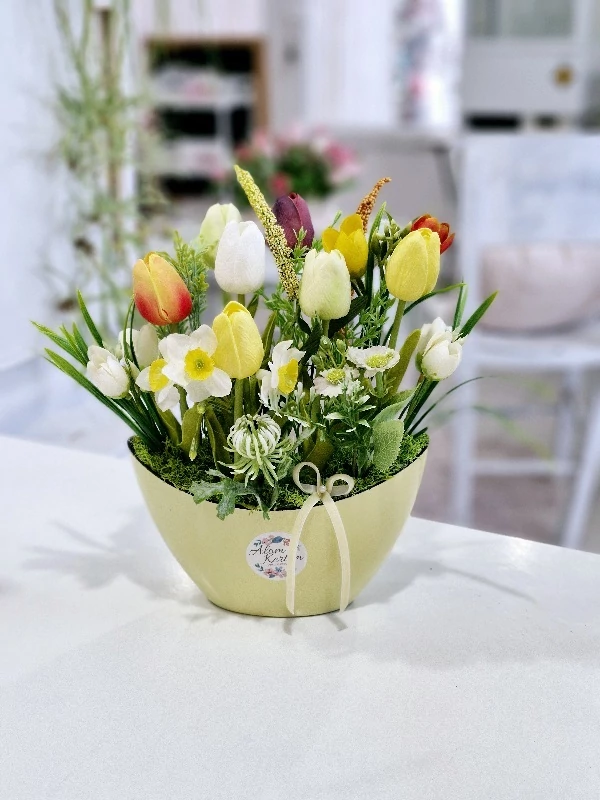 Citromsárga műanyag csónaktál díszítve élethű, minőségi polifoam tulipánokkal, zöldekkel, tavaszi virágokkal, 22x13x28 cm