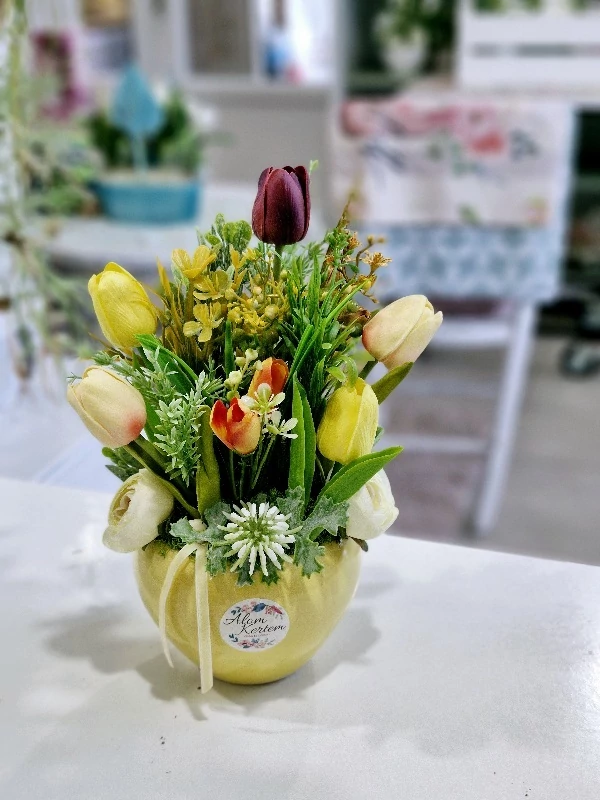 Citrom kerámiakaspó díszítve minőségi, polifoam tulipánokkal, tavaszi virágokkal, zöldekkel, bársonyszalaggal, 20x30