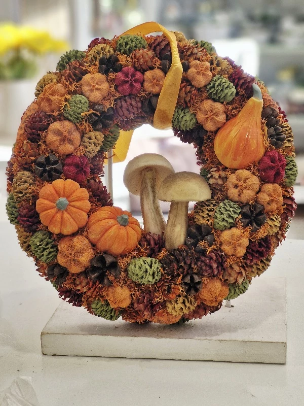 Szalma alap díszítve termésekkel,gipsz tökökkel, teljesen élethű gombákkal, 25 cm