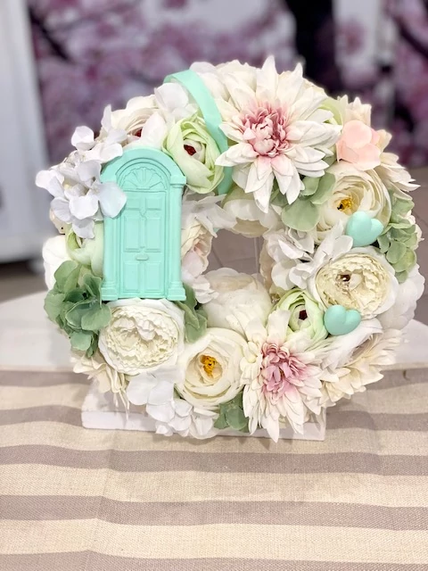 Szalma alap díszítve minőségi selyemvirágokkal, ajtóval szívecskékkel, 29 cm