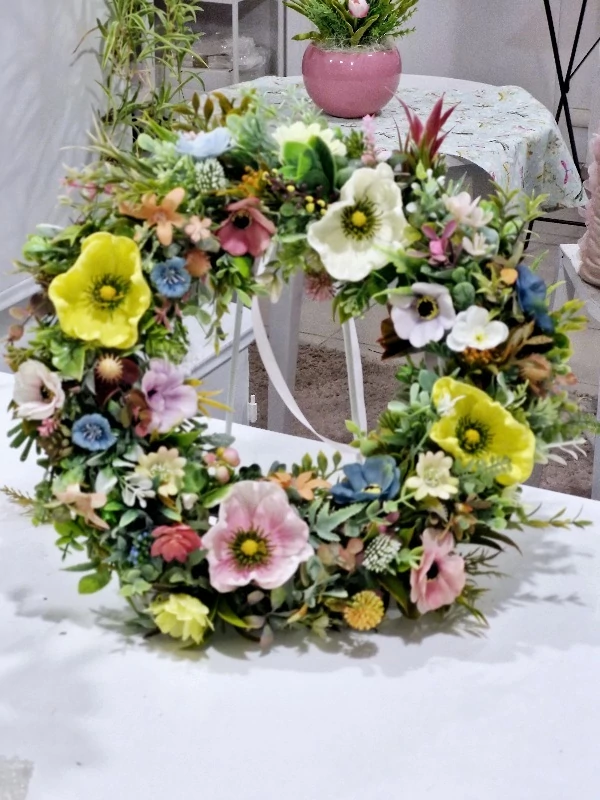 Fehér vessző alap díszítve minőségi, élethű selyemvirágokkal, zöldekkel, tavaszi virágokkal, 40 cm