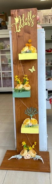 120 cm-es tömör fából készült hazaváró állvány, polcokkal, díszítve minőségi selyemvirágokkal, világítással.