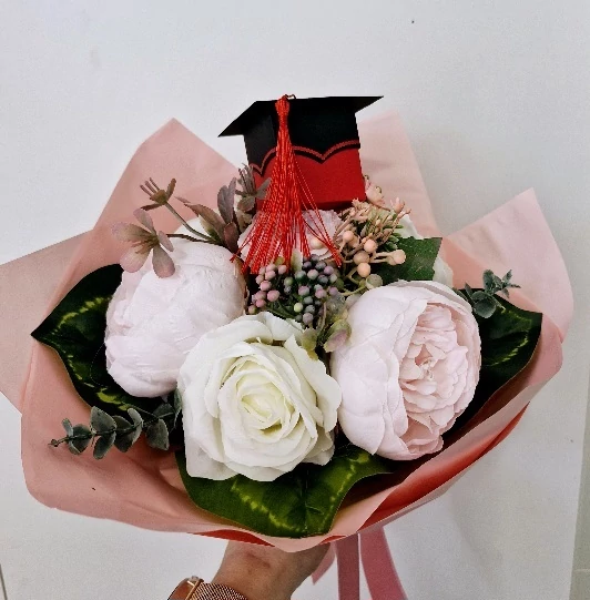 Minőségi, élethű selyemvirágokból, zöldekből kötött ballagási csokor, ballagási kalap pénzátadó dobozzal, 30x35 cm