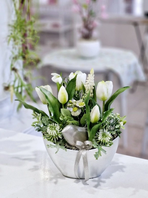 Ezüst műanyag csónakkaspó díszítve, élethű, prémium minőségű gumi tulipánokkal, zöldekkel, tavaszi virágokkal, ezüst madárkával, 21x9x27 cm