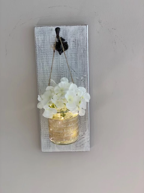Tömör fából készült falidísz, vintage stílusban, hortenziával, és hangulatos tündérfénnyel. A fa alap és a díszítés is kérhető egyedi színvilágban.