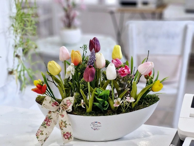 Fehér műanyag csónakkaspó díszítve, élethű, minőségi tulipánokkal, zöldekkel, tavaszi virágokkal, 40x14x31 cm