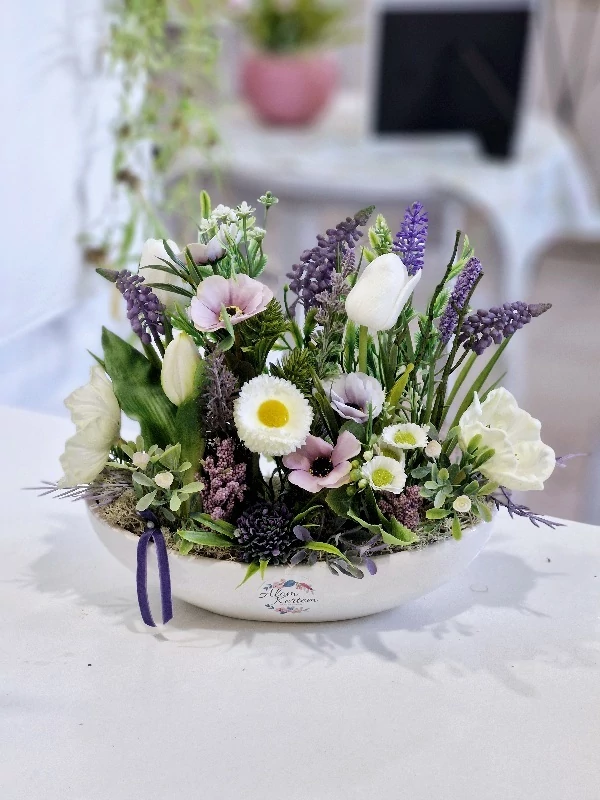 Fehér lapos kerámia kaspó díszítve, élethű, prémium minőségű polifoam tulipánokkal, zöldekkel, tavaszi virágokkal, 32x15x25 cm