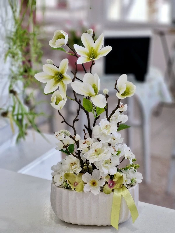 Fehér kerámia kaspó díszítve, élethű, prémium minőségű magnóliával, barackvirágokkal, 19x10x40 cm
