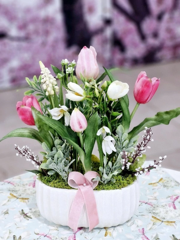 Fehér kerámia kaspó díszítve prémium minőségű polifoam tulipánokkal, zöldekkel, tavaszi virágokkal. 20x30 cm