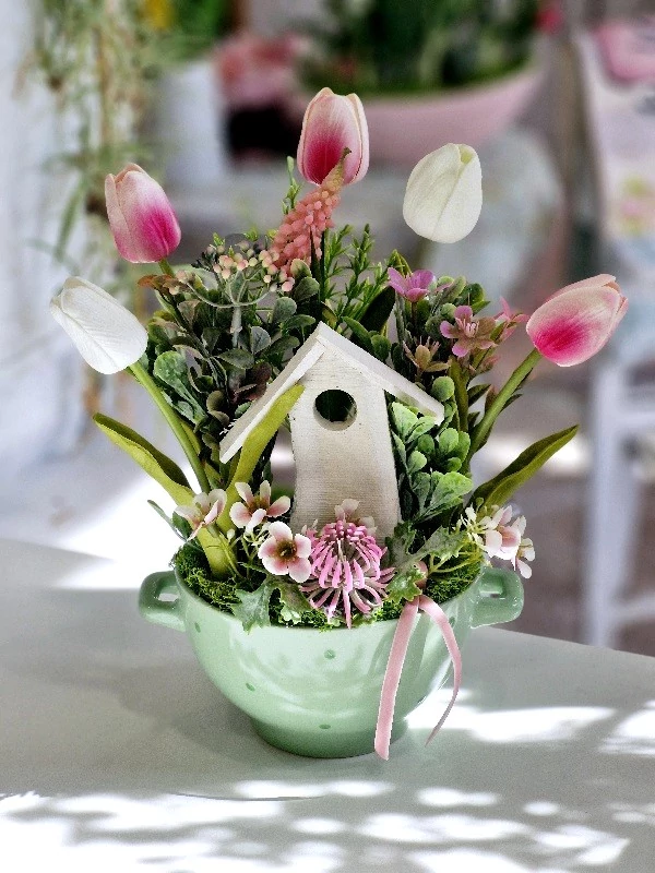 Füles, pöttyös menta színű tál díszítve minőségi, élethű tulipánokkal, selyemvirágokkal, tavaszi virágokkal, fa házikóval, 25x29 cm
