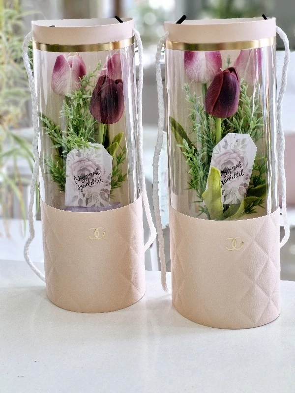 Papír henger díszítve minőségi, polifoam tulipánokkal, zöldekkel, Nagyinak szeretettei táblával, 10x28 cm