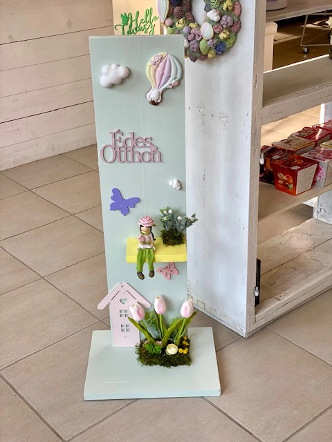 82x33 cm-es fa állvány világos zöldre festve, díszítve Édes otthon fa felirattal, minőségi gumi tulipánokkal, hőlégbalonnal, felhőkkel, kerámia figurával, fa házikóval. Hozzá illő ajtódísszel együtt kedvezményesen vásárolható meg a virágdekorációs szettek menüpontban.