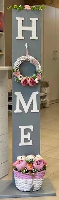 Tömör fából készült hazaváró állvány, HOME felirattal, ajtódísszel, és kosárdísszel, melyek évszaktól megfelelően cserélhetőek.. Egyedi színben is kérhető. 120x40x25 cm. Megrendelést e-mailben, vagy facebookon lehet leadni.
