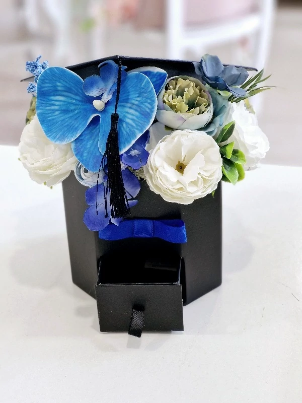 Fekete ballagós kalapos papírdoboz díszítve minőségi selyemvirágokkal, zöldekkel. A doboz alján beépített fiókkal, ahova elhelyezhető a kisebb ajándék vagy a pénz, 23x21 cm