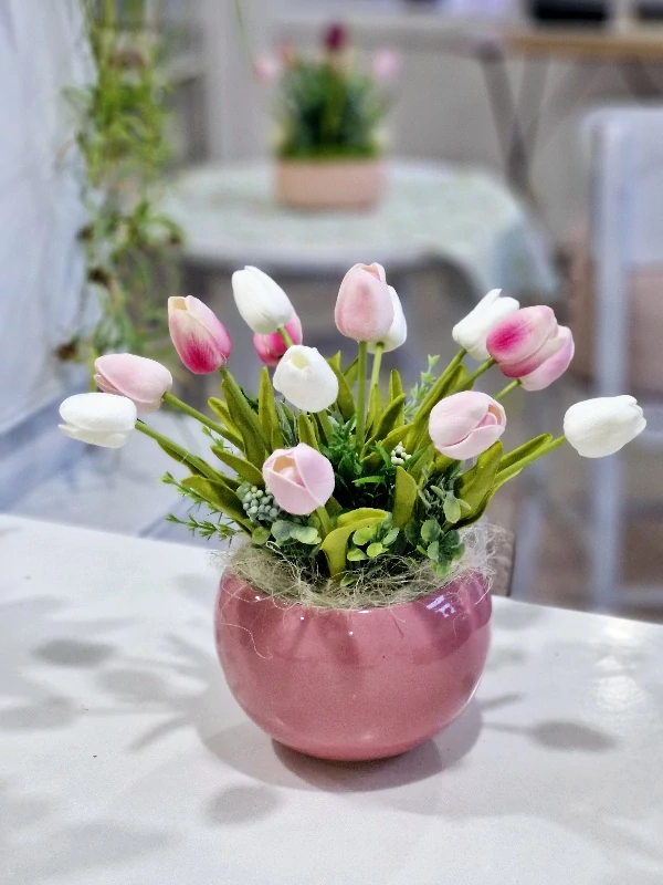 Mályva kerámia kaspó díszítve prémium minőségű polifoam tulipánokkal, zöldekkel, 34x33 cm