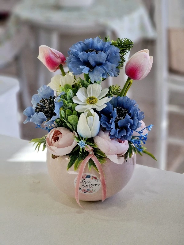 Rózsaszín kerámia kaspó díszítve, élethű, prémium minőségű polifoam tulipánokkal, kék virágokkal, zöldekkel, 18x25 cm