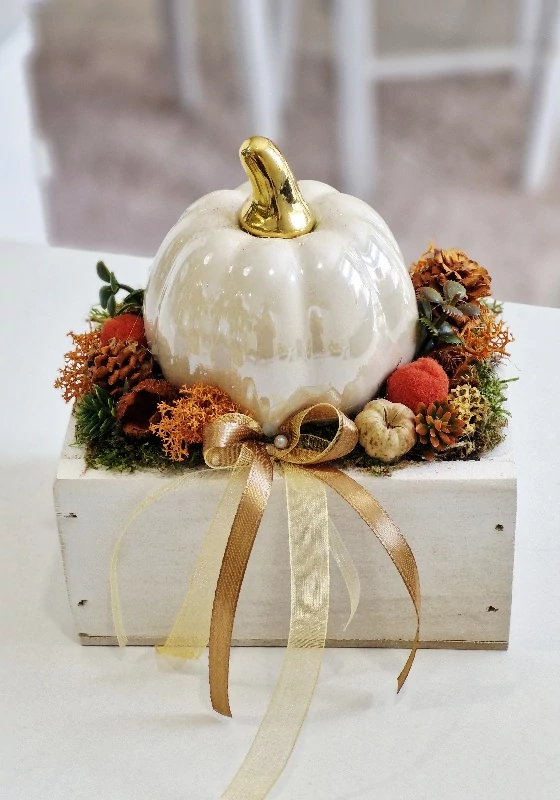 Fehér fa láda díszítve krém selyemfényű kerámia tökkel, termésekkel, 13x15x10 cm