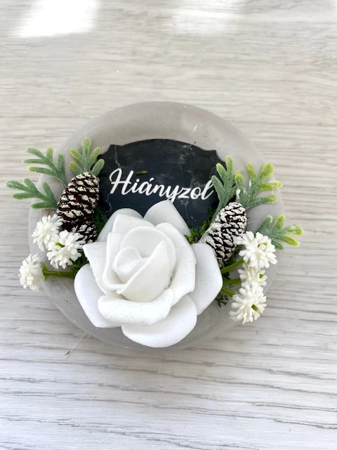 Kerek, peremes gipsz alap díszítve hiányzol felirattal, polifoam rózsával, zöldekkel, termésekkel. 9x3 cm