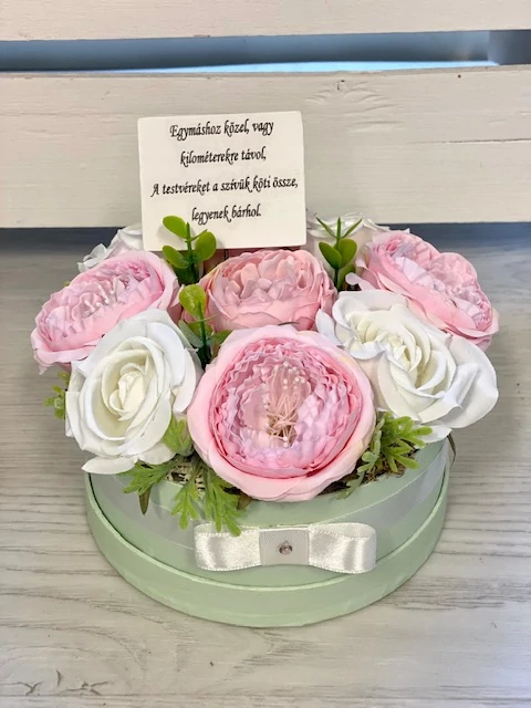 Halvány mentazöld papírdoboz díszítve minőségi selyemvirágokkal, zöldekkel, szalaggal, masnival, idézetes fa táblával. A tábla szövege módosítható, amelyet a megrendelés legvégén lévő megjegyzés rovatba szükséges jelezni. 19x15 cm