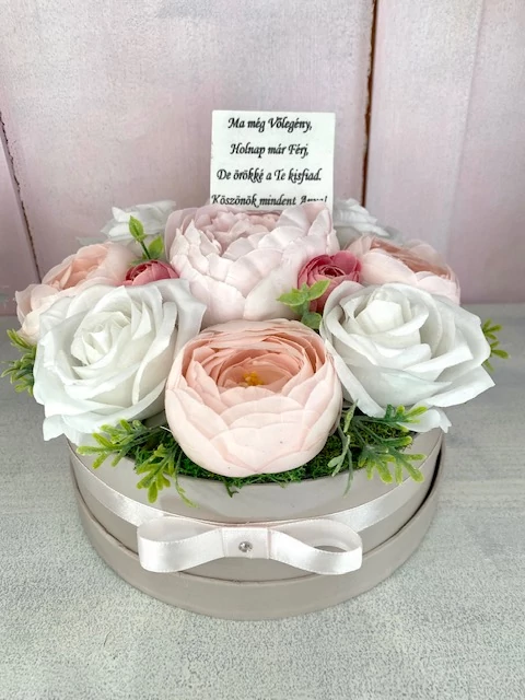 Púder papírdoboz díszítve minőségi selyemvirágokkal, szalaggal, masnival, idézetes fa táblával. A tábla szövege módosítható, amelyet a megrendelés legvégén lévő megjegyzés rovatba szükséges jelezni. 21x15 cm
