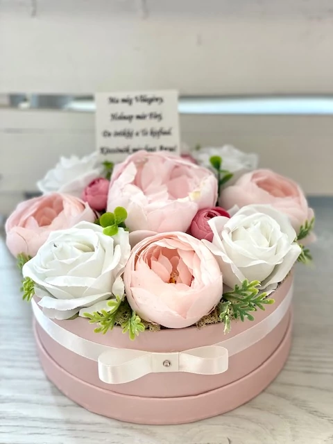 Halvány rózsaszín papírdoboz díszítve minőségi selyemrózsákkal, zöldekkel, szalaggal és masnival, idézetes fa táblával. A tábla szövege módosítható, amelyet a megrendelés legvégén lévő megjegyzés rovatba szükséges jelezni. 24x17 cm