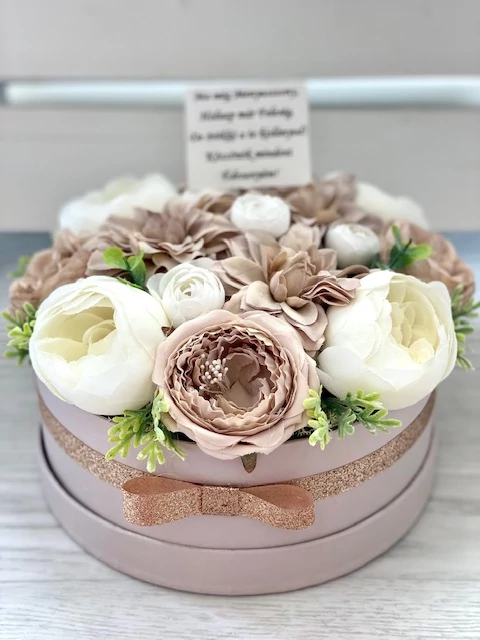 Tejeskávé színű papírdoboz díszítve minőségi selyemrózsákkal, zöldekkel, csillogó szalaggal és masnival, idézetes fa táblával. A tábla szövege módosítható, amelyet a megrendelés legvégén lévő megjegyzés rovatba szükséges jelezni. 24x18 cm