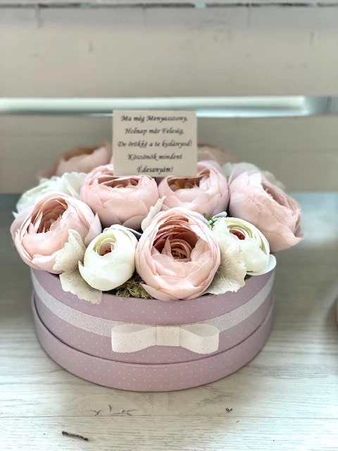 Halvány lila vanília pöttyös papírdoboz díszítve minőségi selyemvirágokkal, fehér csillogó levelekkel, idézetes fa táblával, csillogó szalaggal és masnival. A tábla szövege módosítható, amelyet a megrendelés legvégén lévő megjegyzés rovatba szükséges jelezni. 24x17 cm