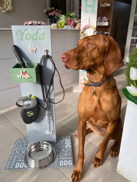 80 cm-es tömör fából készült állvány, melyen kényelmesen elhelyezhetjük a kedvenceink kellékeit, mint a pórázok, nyakörvek, a kis ládikában pedig tarthatjuk a kutyazacskót, fésűt, bármit. Az állvány alján tálalátét található, melyre rátehetjük kedvencük tálkáit, az alátét pedig megvédi az állványt az esetlegesen kiömlő víztől, ételtől.