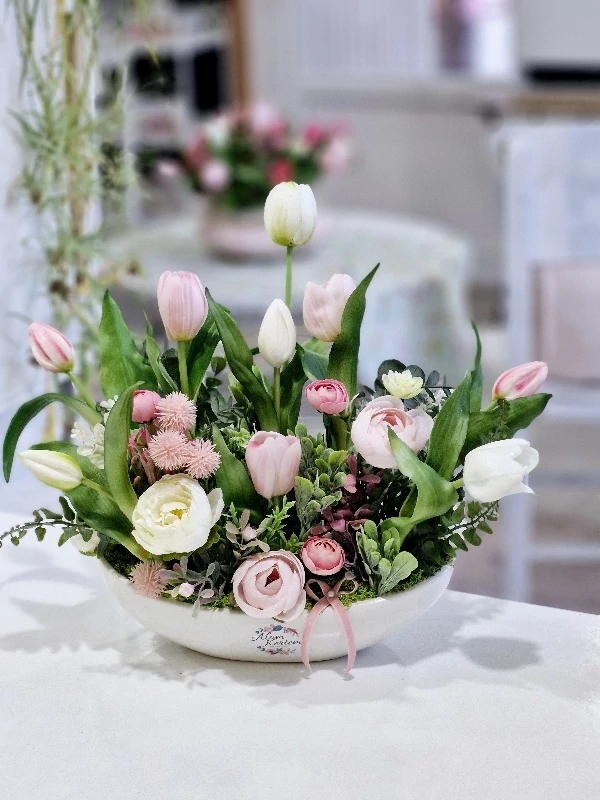 Fehér kerámia csónakkaspó díszítve prémium minőségű, élethű gumi tulipánokkal, selyemvirágokkal, zöldekkel, 36x15x32 cm