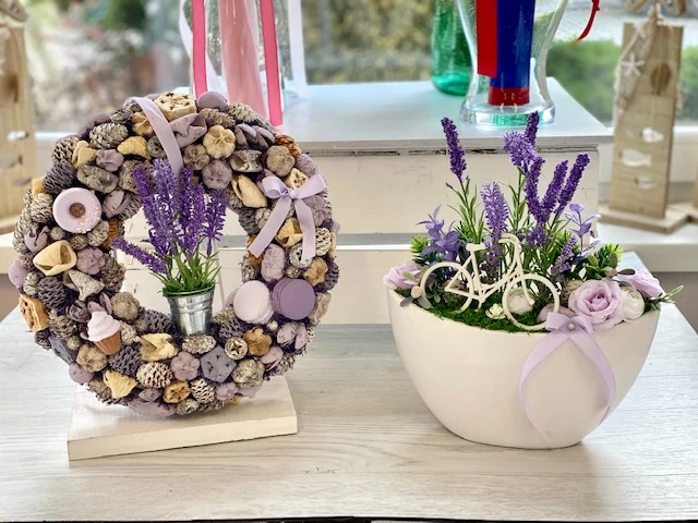 Fehér kerámiacsónak kaspó díszítve minőségi, élethű levendulákkal, selyemvirágokkal, zöldekkel, fa biciklivel, lila masnival, 24x10x29 cm
