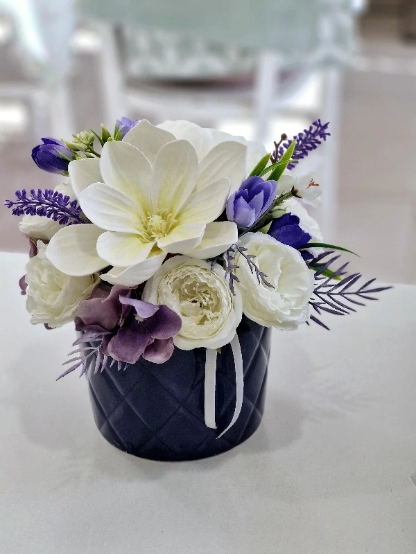 Különleges lila kerámia kaspó lábakon, díszítve minőségi, élethű magnóliával, selyemvirágokkal, tavaszi virágokkal, 24x24 cm