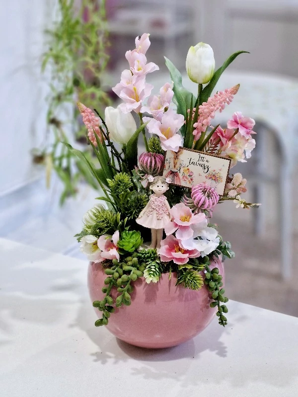 Rózsaszín kerámia kaspó díszítve, élethű, prémium minőségű gumi tulipánokkal, zöldekkel, tavaszi virágokkal, kislány kerámia figurával, 19x38 cm