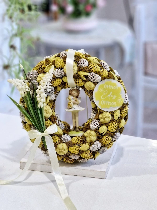 Szalma alap díszítve termésekkel, kislány cicás figurával, gyöngyikékkel, Édes otthon plexi táblával, 26 cm