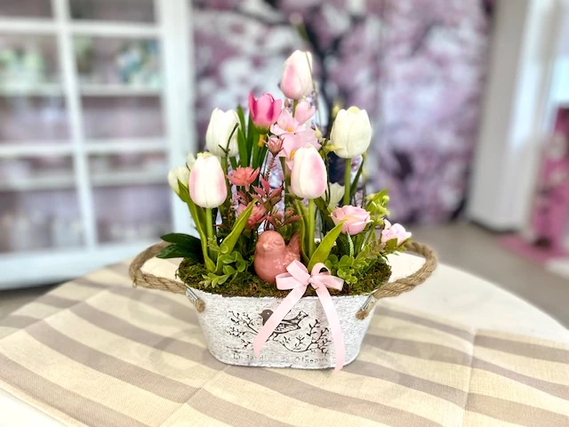 Madárkás bádogtál díszítve minőségi, élethű gumi tulipánokkal, zöldekkel, kerámia madárkával, masnival, 18x14x29 cm a fülek nélkül