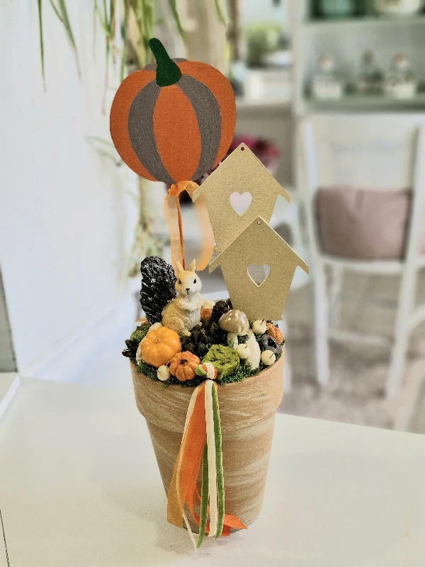 Magas agyagkaspó díszítve fa tökkel, házikókkal, mókussal, őszi termésekkel, 15x45 cm