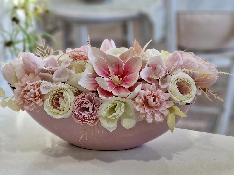 Rózsaszín műanyag csónaktál díszítve prémium minőségű magnóliával, tulipánokkal, minőségi, élethű selyemvirágokkal, 44x22x20 cm