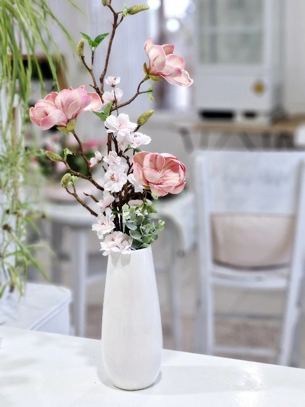 Kerámia váza díszítve prémium minőségű magnóliával, barackvirággal, zölddel, 67x10 cm