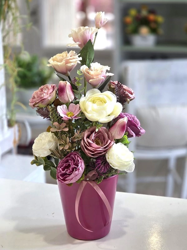 Kerámia kaspó díszítve minőségi selyemvirágokkal, tulipánokkal, zöldekkel, 23x46 cm