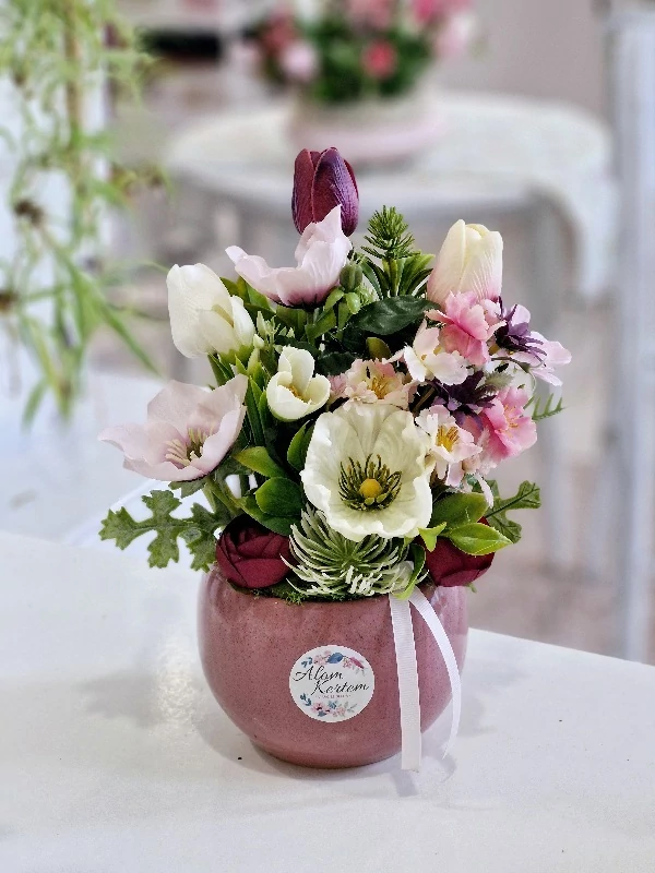 Mályva kaspó díszítve minőségi tavaszi virágokkal, tulipánokkal, zöldekkel, 21x28 cm