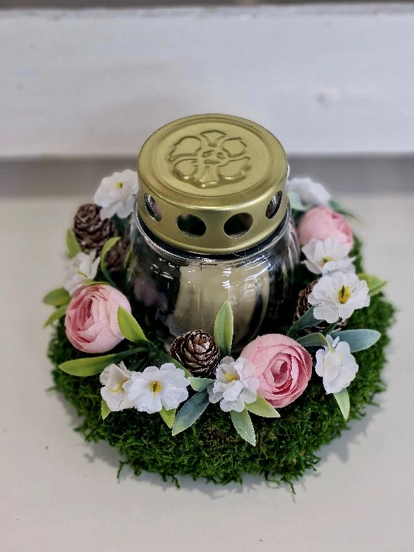 Moha koszorú díszítve minőségi selyemvirágokkal, termésekkel, zöldekkel, közepében mécsessel, 13 cm